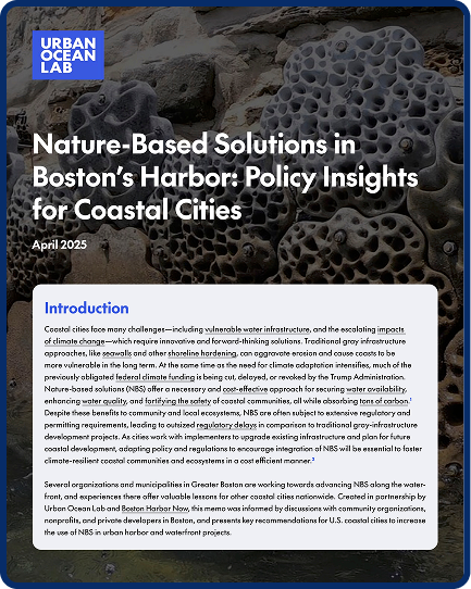 A policy memo in partnership with Stone Living Lab, Nature-Based Solutions in Boston’s Harbor. Drawing on discussions with community organizations, nonprofits, and private developers, the memo provides recommendations to help coastal cities scale the use of nature-based solutions in urban harbor and waterfront projects.